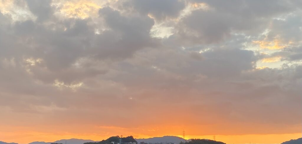 昨夕は、厚く低い雲が空を覆い、夕陽が窮屈そうだったけれど、