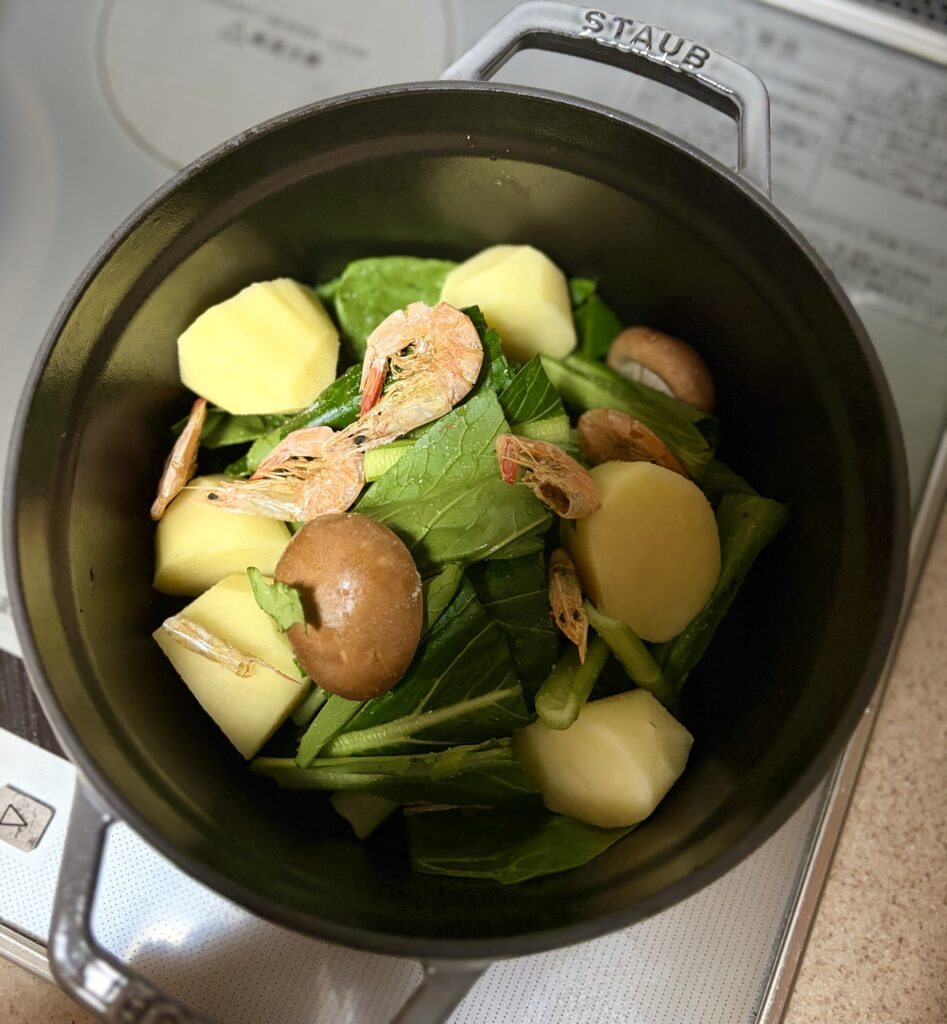 同じく産直市場で買った小松菜と新じゃがで煮物を作った。