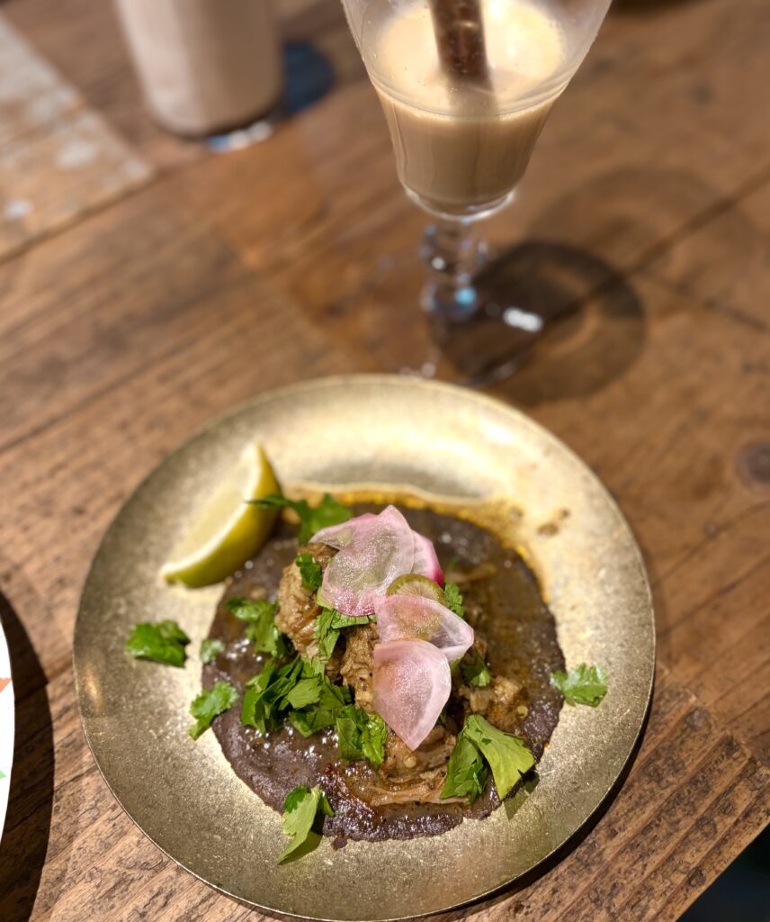 締めには、パクチーと蕪のアチャールをトッピングしたポークヴィンダルータコスとクラフトビールを。