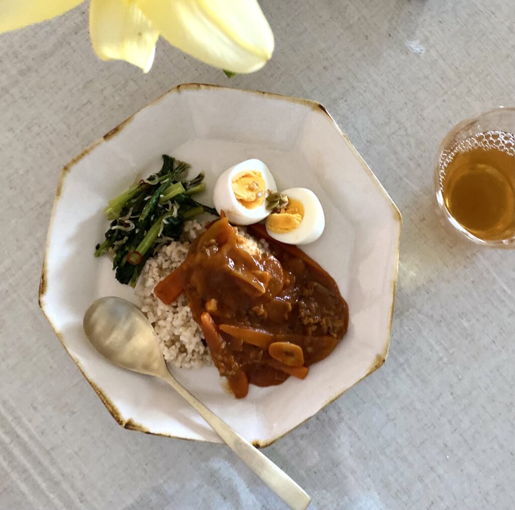 ご飯は、発芽させた玄米に黒米少々で炊いてみた。ハヤシライスには、玄米のパラっと加減が合っていると思った。