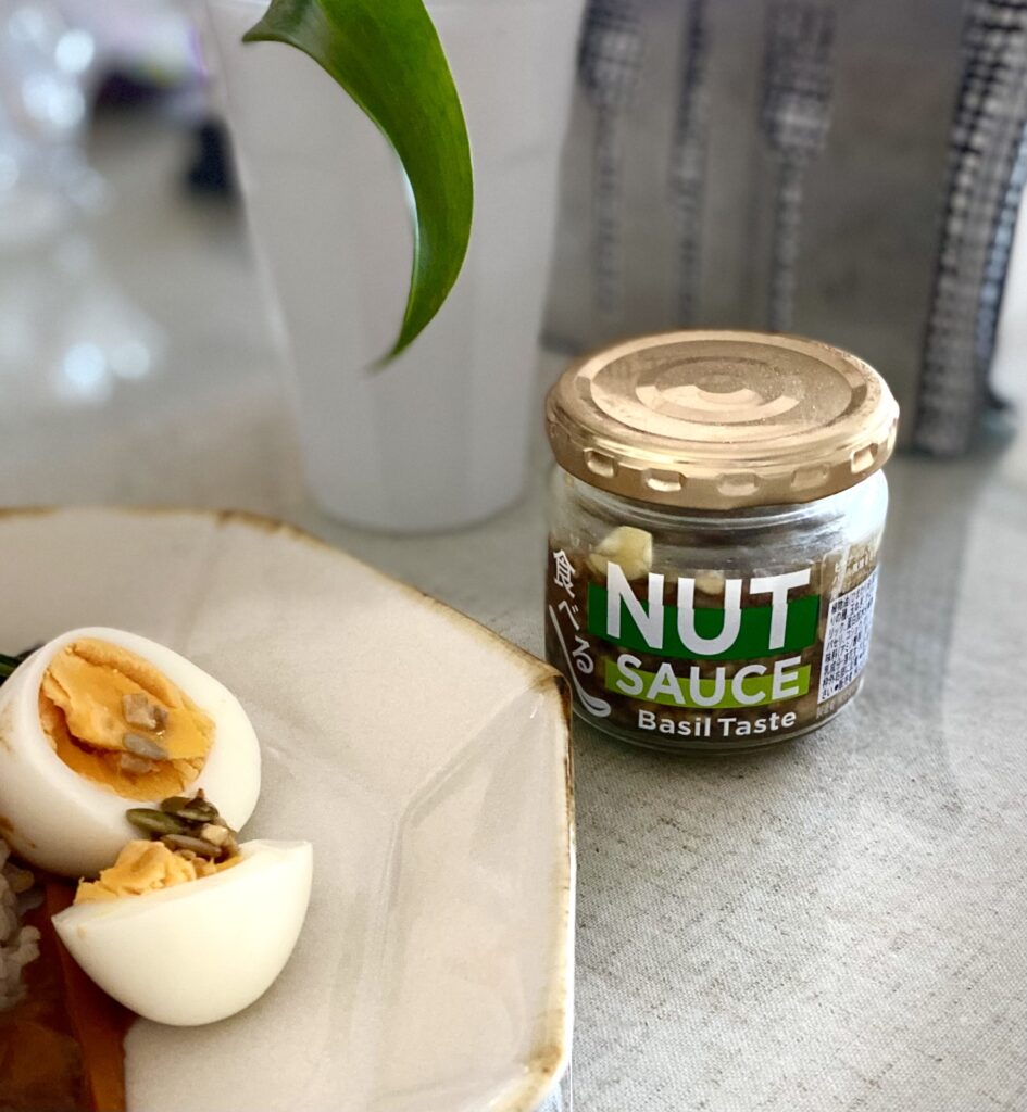 友人に教えてもらって以来リピート買いしているKALDIの『食べるナッツソース・バジルテイスト』を載せた茹で卵。