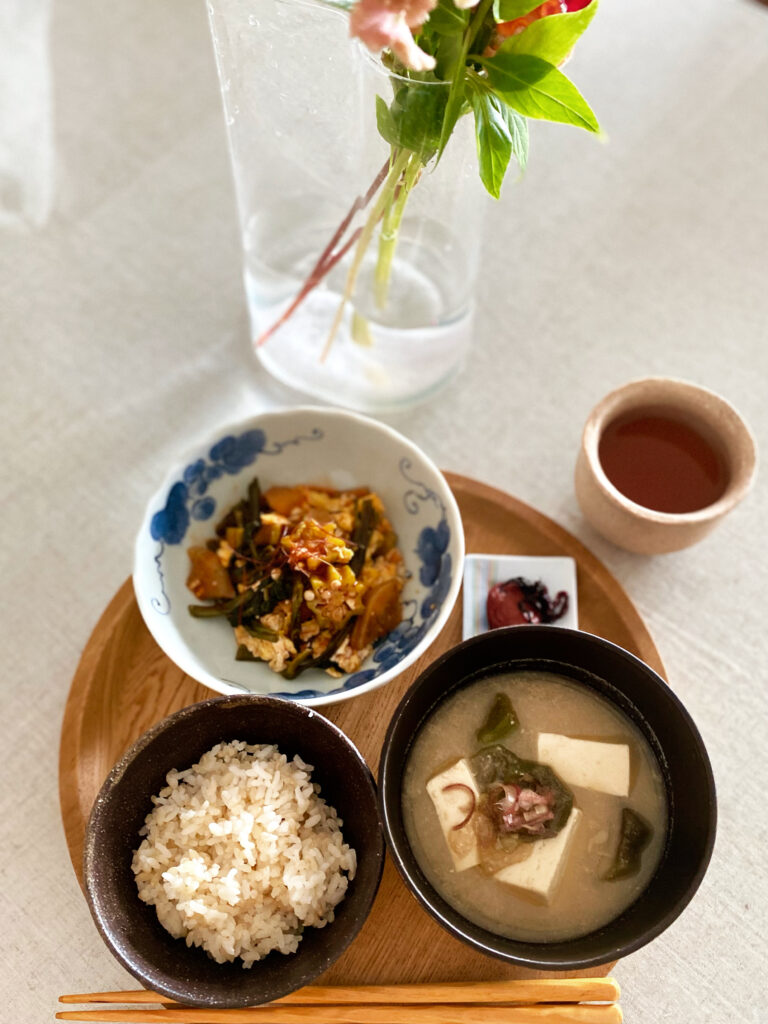 ヘチマと豆腐の味噌汁(吸い口は茗荷)、梅干し、玄米と白米のミックスご飯と煮出し番茶。