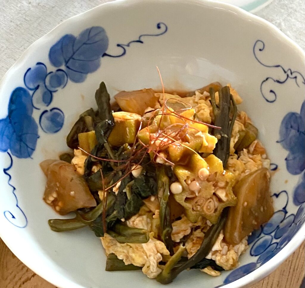 今日の昼食は、MANA FARM の空心菜とオクラ(ダビデの星)と白茄子と炒り卵を天津飯っぽい酢トマトの味付けにした炒めものと、