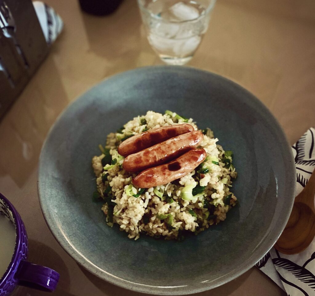 今日の昼食は、余っていた葉野菜と葱とチリメンジャコの玄米炒飯にした。(+ジャガイモ豆乳スープ)
