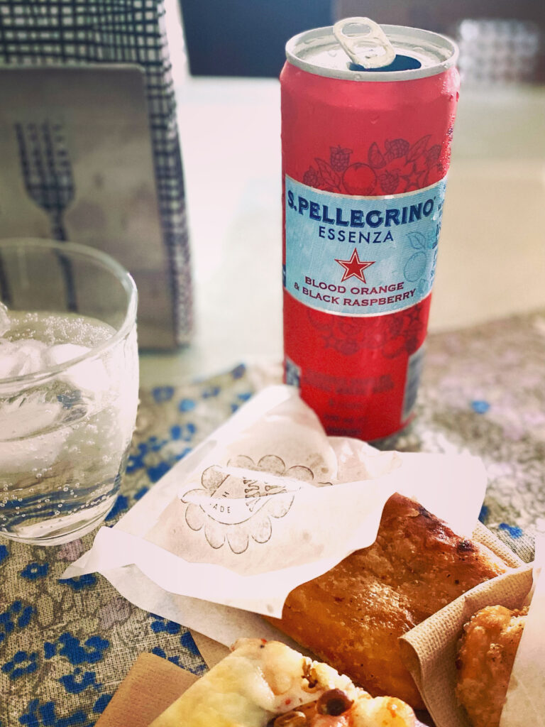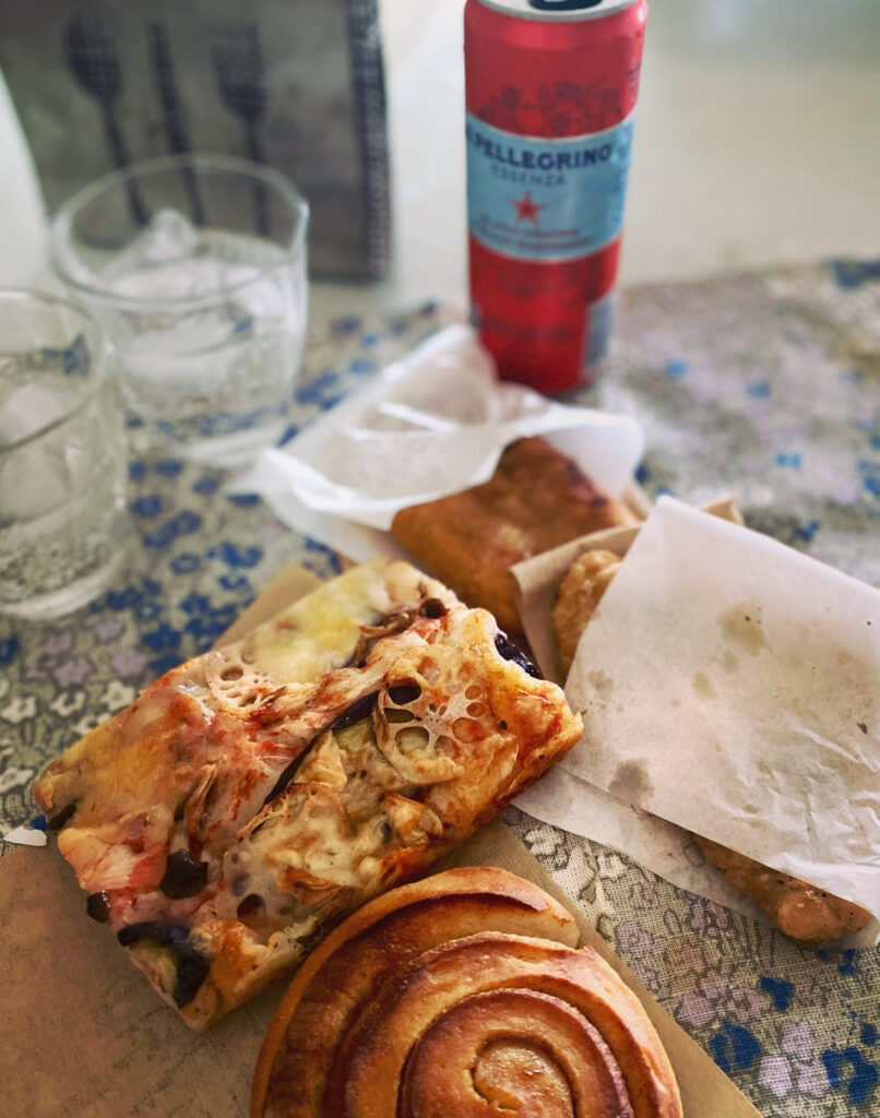 自宅に戻り、出店で買ったフォカッチャと、シナモンロールと、エンパナーダと、ブラッドオレンジとブラックベリーフレーバーの炭酸水で昼食を食べた。