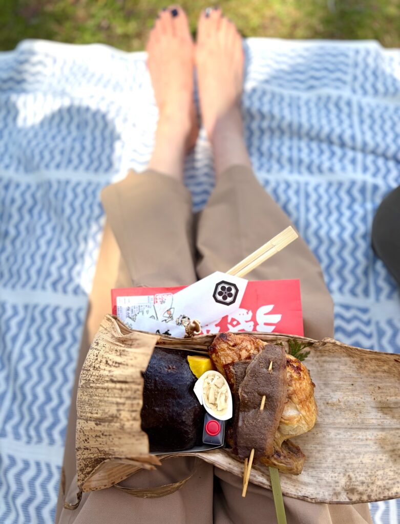 私達は、大きなおにぎり鶏と牛の串焼きのお弁当。