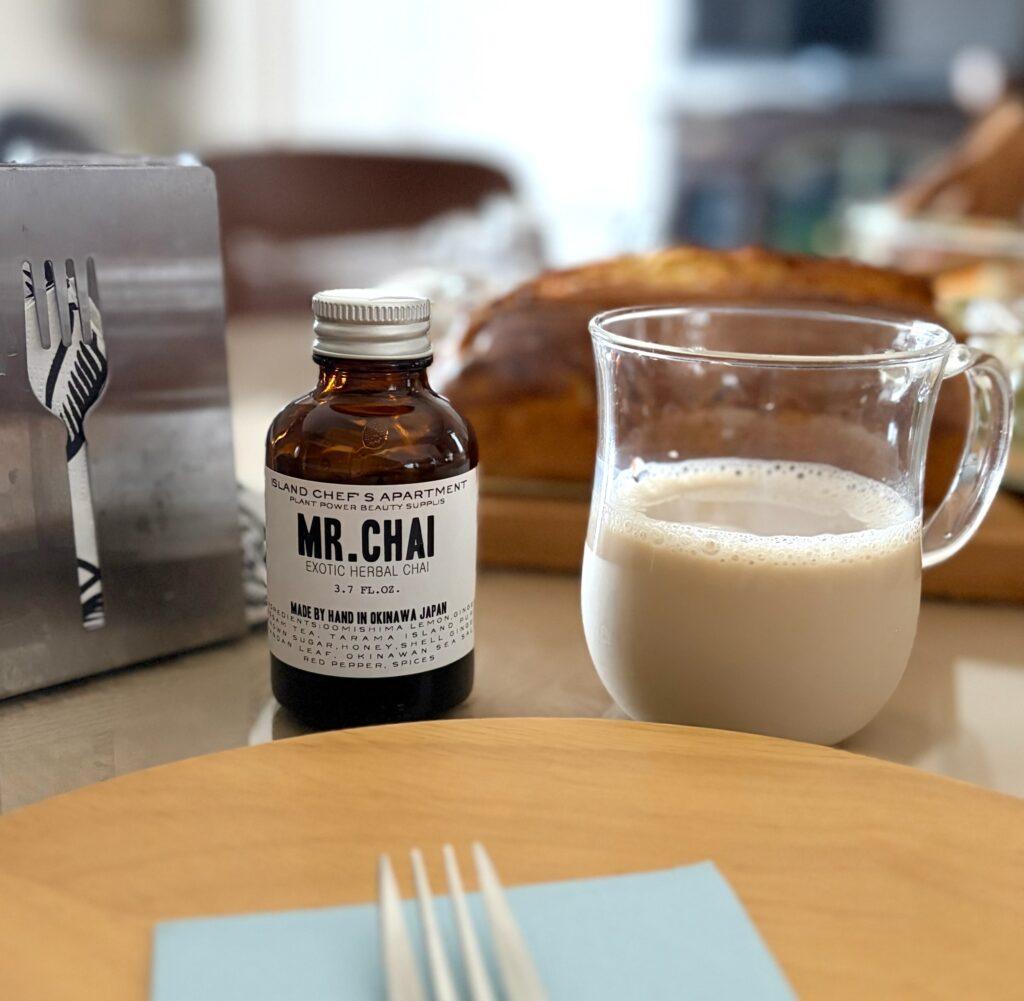 娘夫婦のお土産のハーブ入りのチャイシロップで作った豆乳チャイを添えた朝食を食べた。