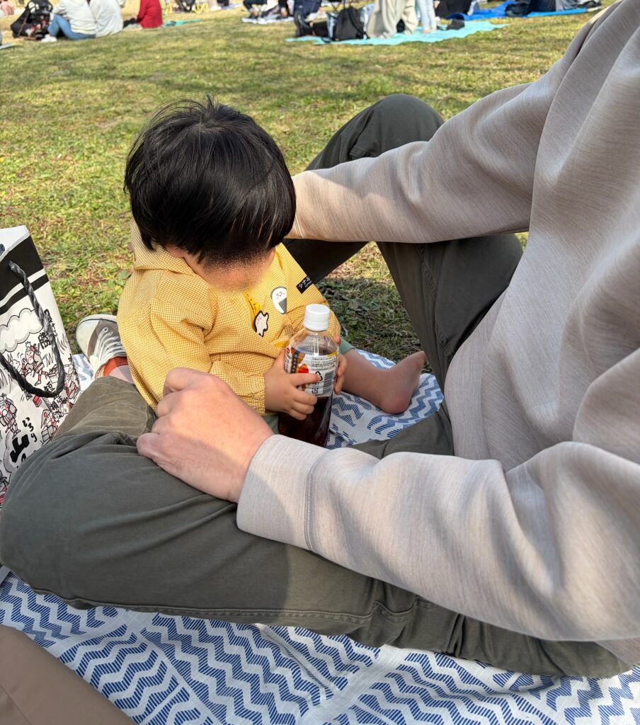 ↑離乳食をお腹いっぱい食べて、お茶の入ったペットボトルでひとしきり遊ぶ孫。