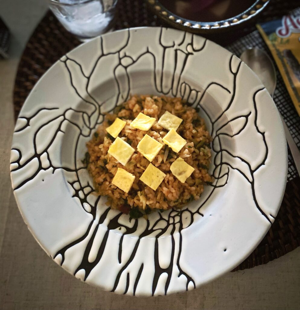 前日の炒飯に使った残りの葉野菜と、長女からお土産にもらっていたサラミを具材にしたケチャップ玄米ライスと、