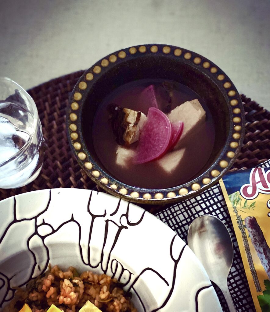 3分の1残っていた親芋(里芋)と半分残っていた紅くるり大根のコンソメスープ♪
