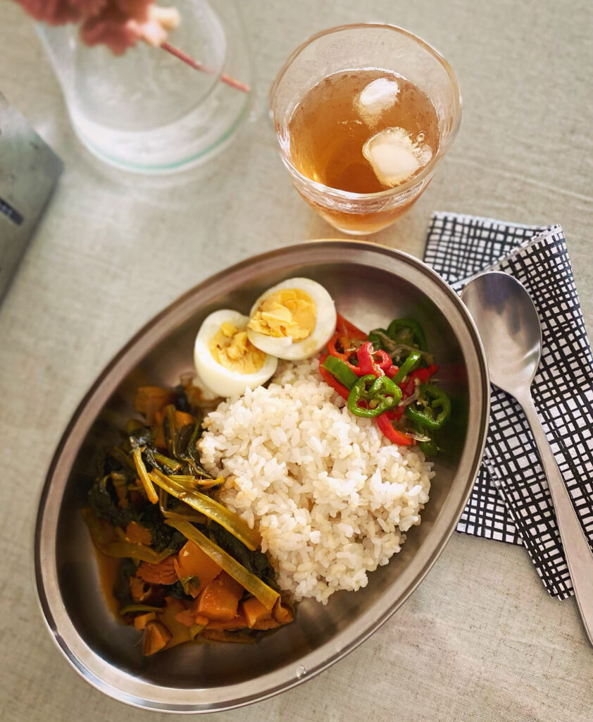 今日の昼食は、小松菜、茄子、椎茸、ももハムのカレー。