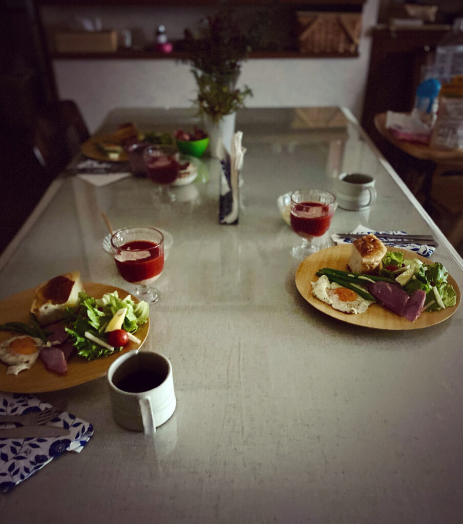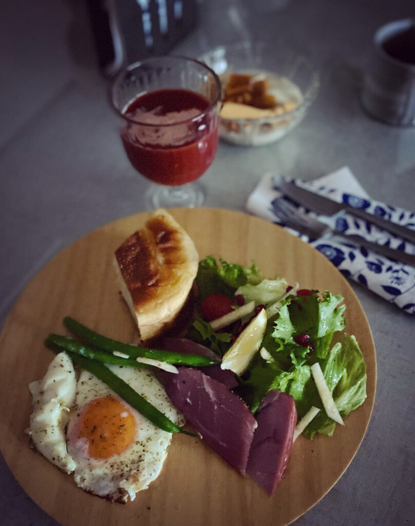 朝食は、柘榴と洋梨をトッピングしたサラダに、骨付きハムを添えて食べた。