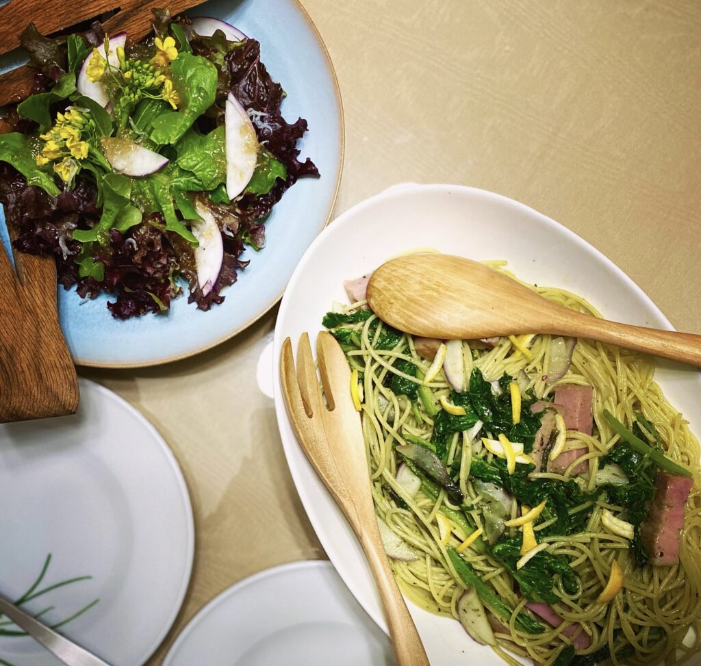昨夜は、MANAFARMの野菜を使ったジェノベーゼソースのパスタとサラダの夕食を食べて、