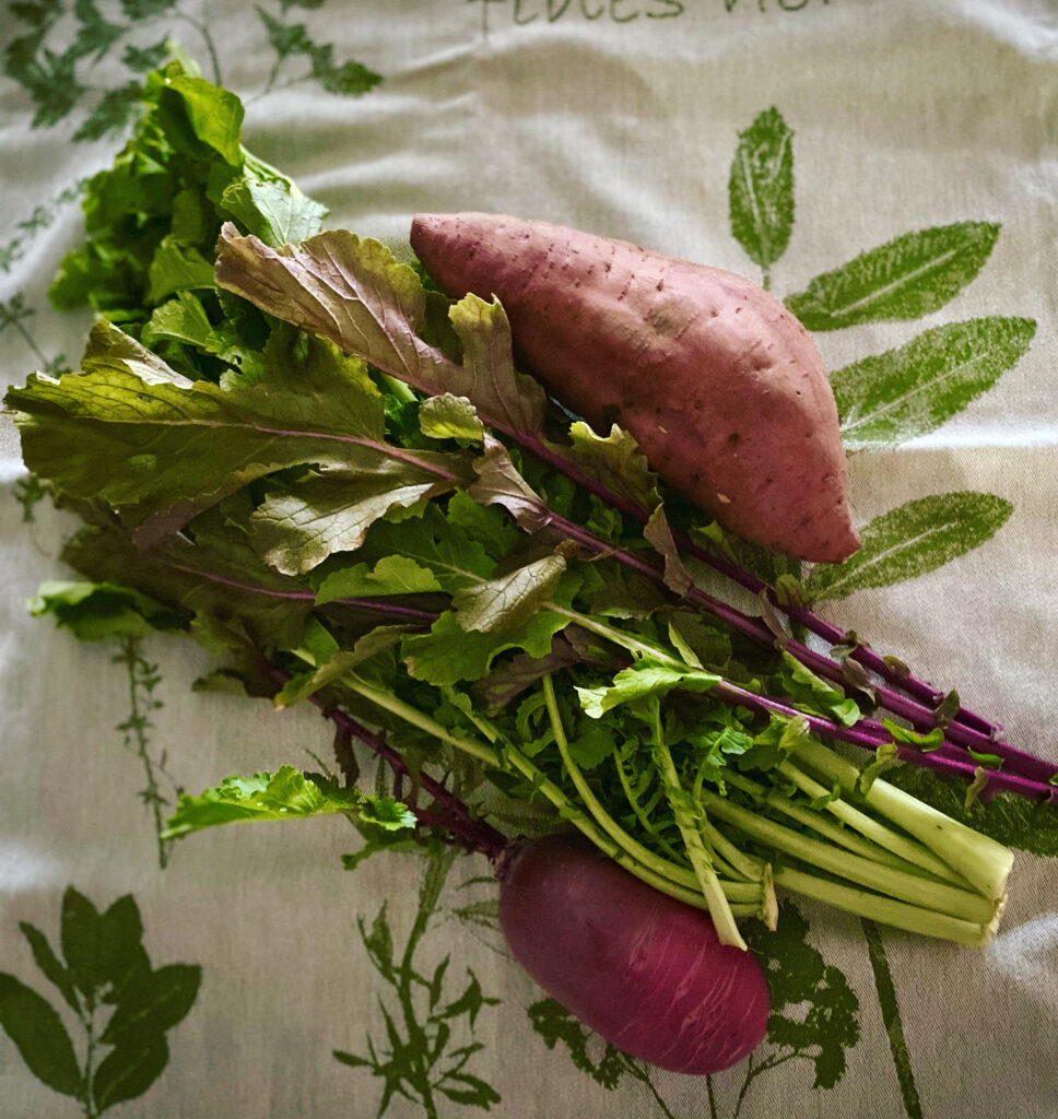今日の昼食は、MANAFARMから届いた大根葉、紅はるか、紅くるり大根で、