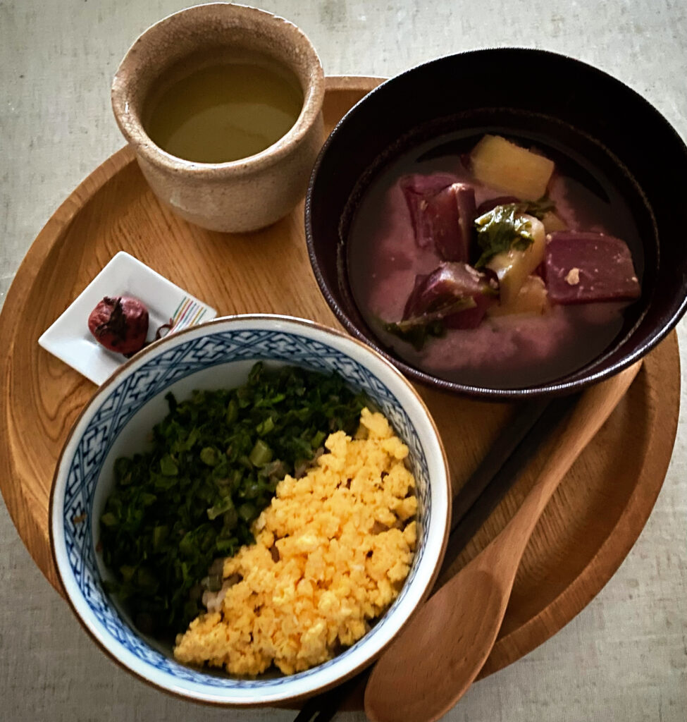 大根葉と鰹節の胡麻油炒め+炒り卵の二色丼と、