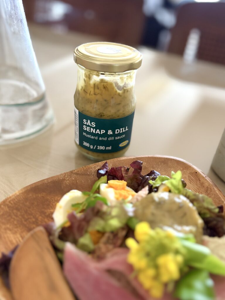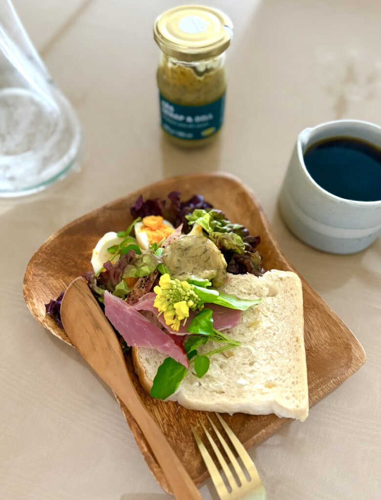 娘家族と一緒に訪れた道の駅で購入したレモンピール入りのパンに、娘のお土産のディルソースを載せたオープンサンドと、
