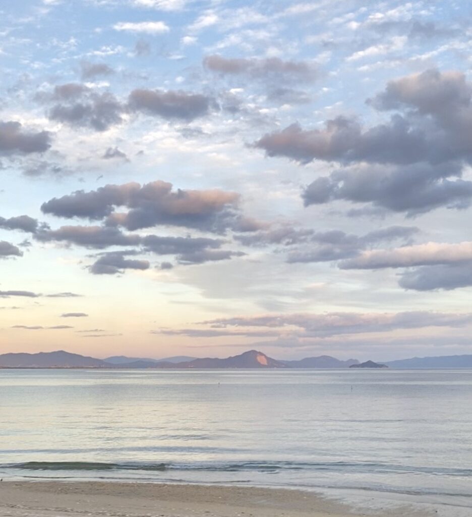 夕焼けが始まった空と、夕空を映した海。どちらも美しい♪