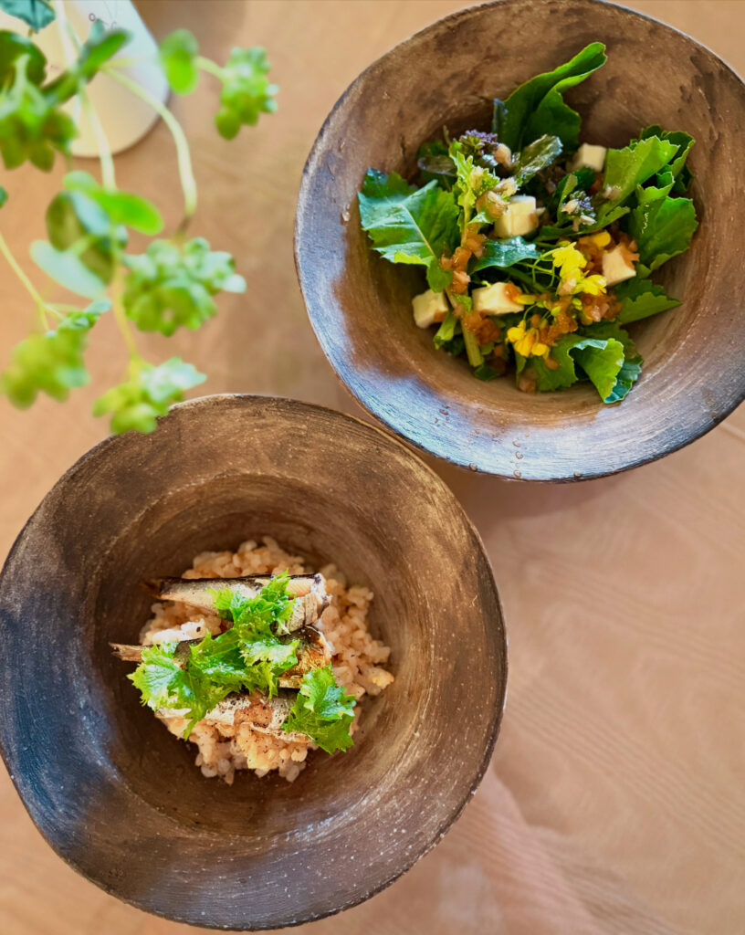 今日の昼食は、MANAFARMのワサビ菜を使ったオイルサーディン丼。