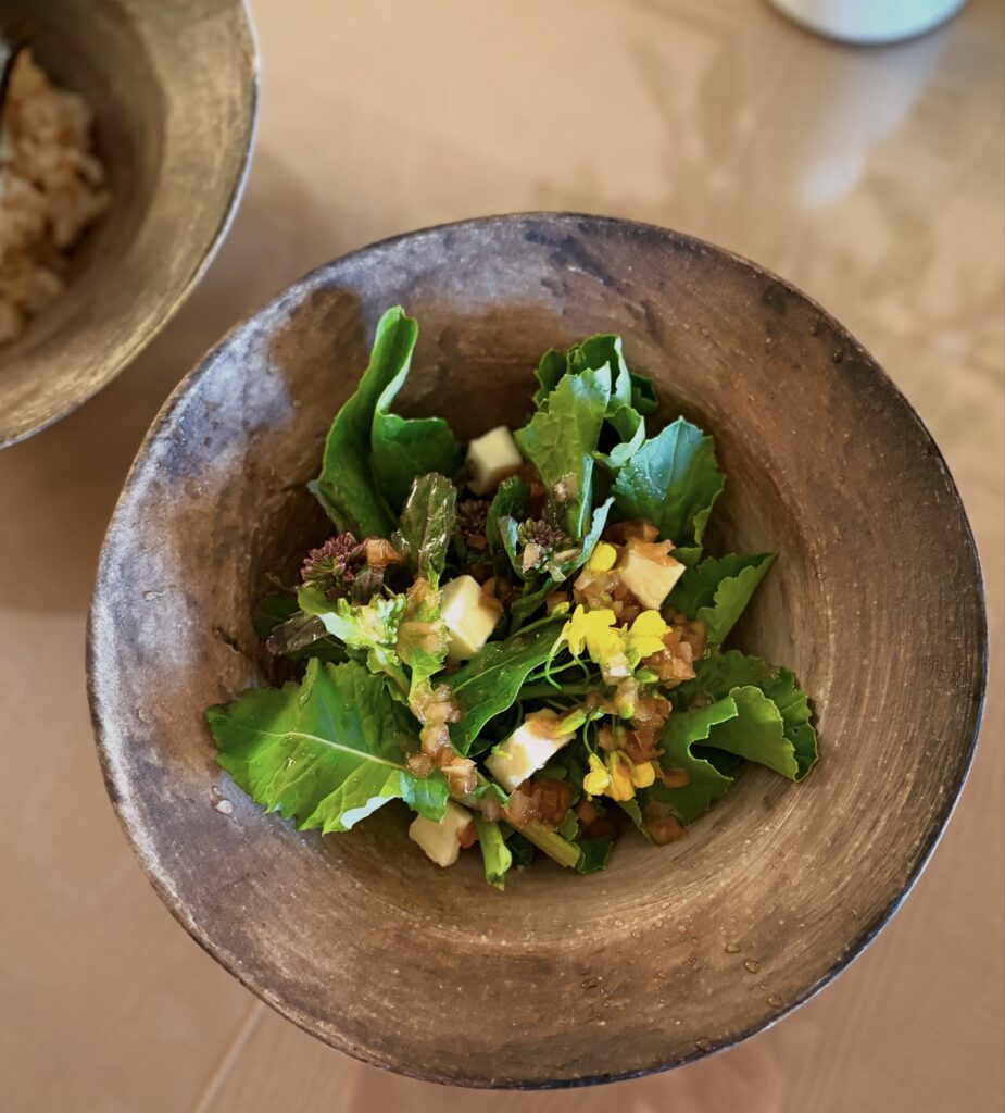 そして、新玉ねぎのドレッシングをかけた菜花とサラダケールのサラダ。