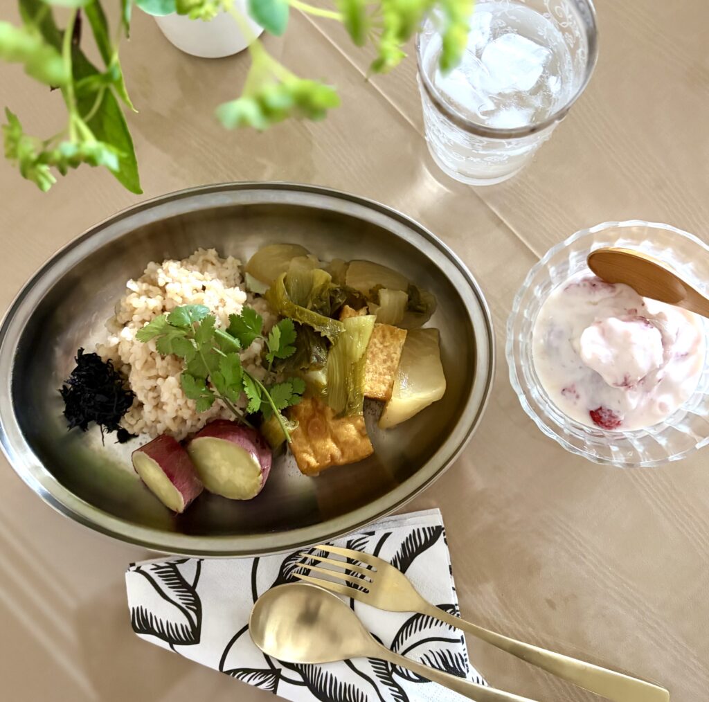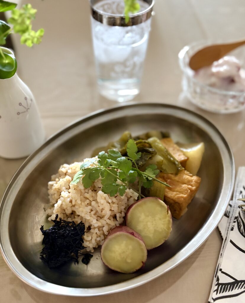 今日の昼食は、厚揚げと、MANAFARM から届いた野菜(祝蕾と聖護院蕪、トッピングにパクチー)を使った玄米カレー。