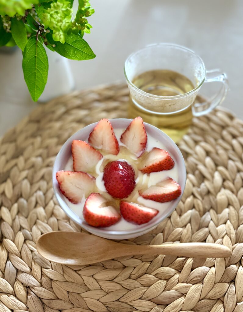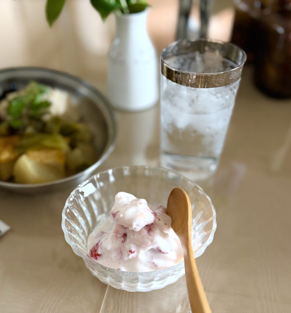 デザートは、いただきものの苺で作ったフローズンヨーグルト。