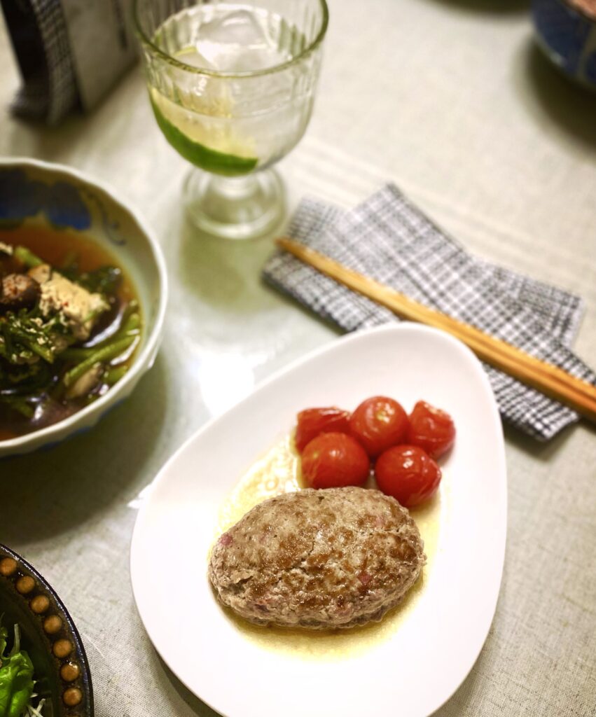 ❸ハンバーグとミニトマトを器に盛り付け、フライパンに残った汁をかけて完成。(ミニトマトを潰してハンバーグと一緒に食べる。)